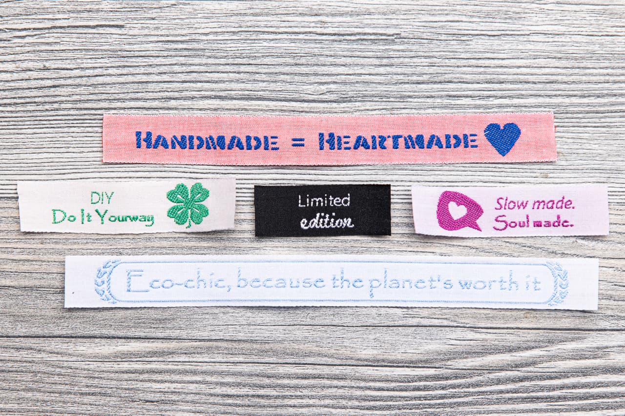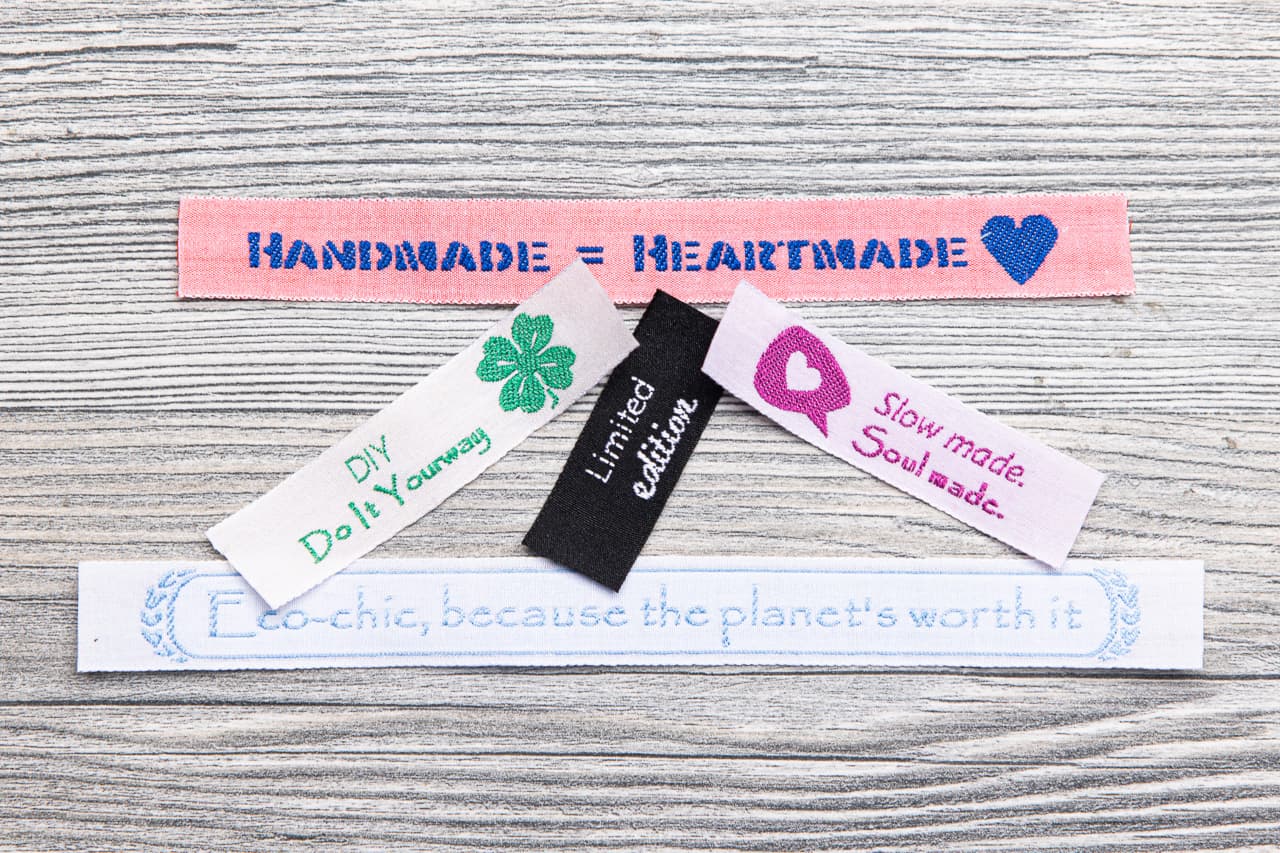 Afmetingen (H x B): Label "Limited Edition": 15 mm x 32 mm; Label "Do It Yourway": 15 mm x 56 mm; Label "Slow made. Soul made.": 15 mm x 50 mm; Label "Handmade = Heartmade": 15 mm x 122 mm; Label "Eco-chic, because the planet's worth it": 15 mm x 143 mm