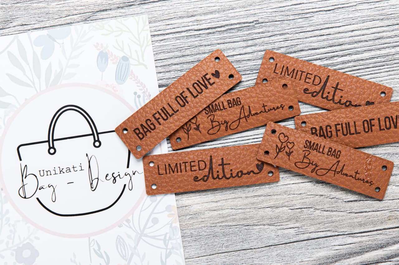 6 lasergegraveerde labels met kleine statements voor tassen en accessoires