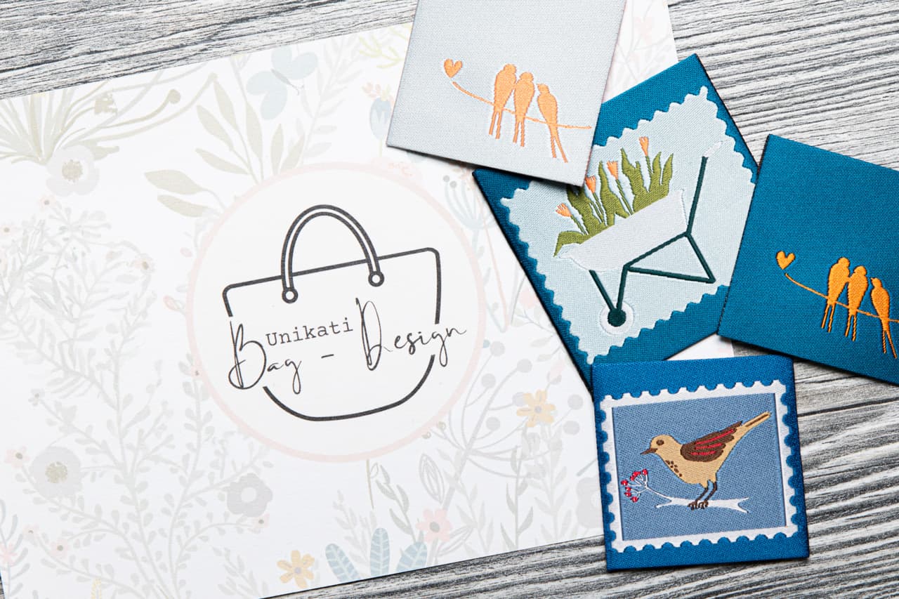 De vier designs tonen verschillende scènes. De bloemenschubkar voelt levendig en ambachtelijk. Het vogel-label doet denken aan een kleine illustratie in labelstijl. De twee vogeltrio’s nemen het motief in twee varianten op en brengen beweging op tassen, rugzakken of accessoires. Je zet de labels bewust in als zichtbaar detail.
