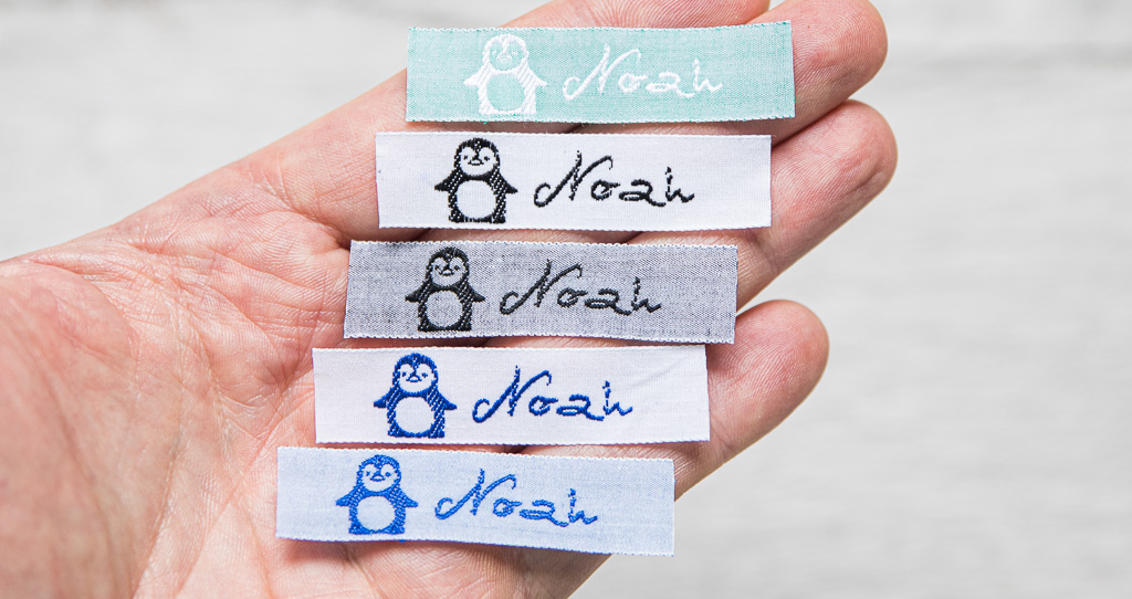 Geweven katoenen label met pinguïnmotief, in het kleurenset ‘Classic Light’, ideaal voor kinderkleding. Nu personaliseren.